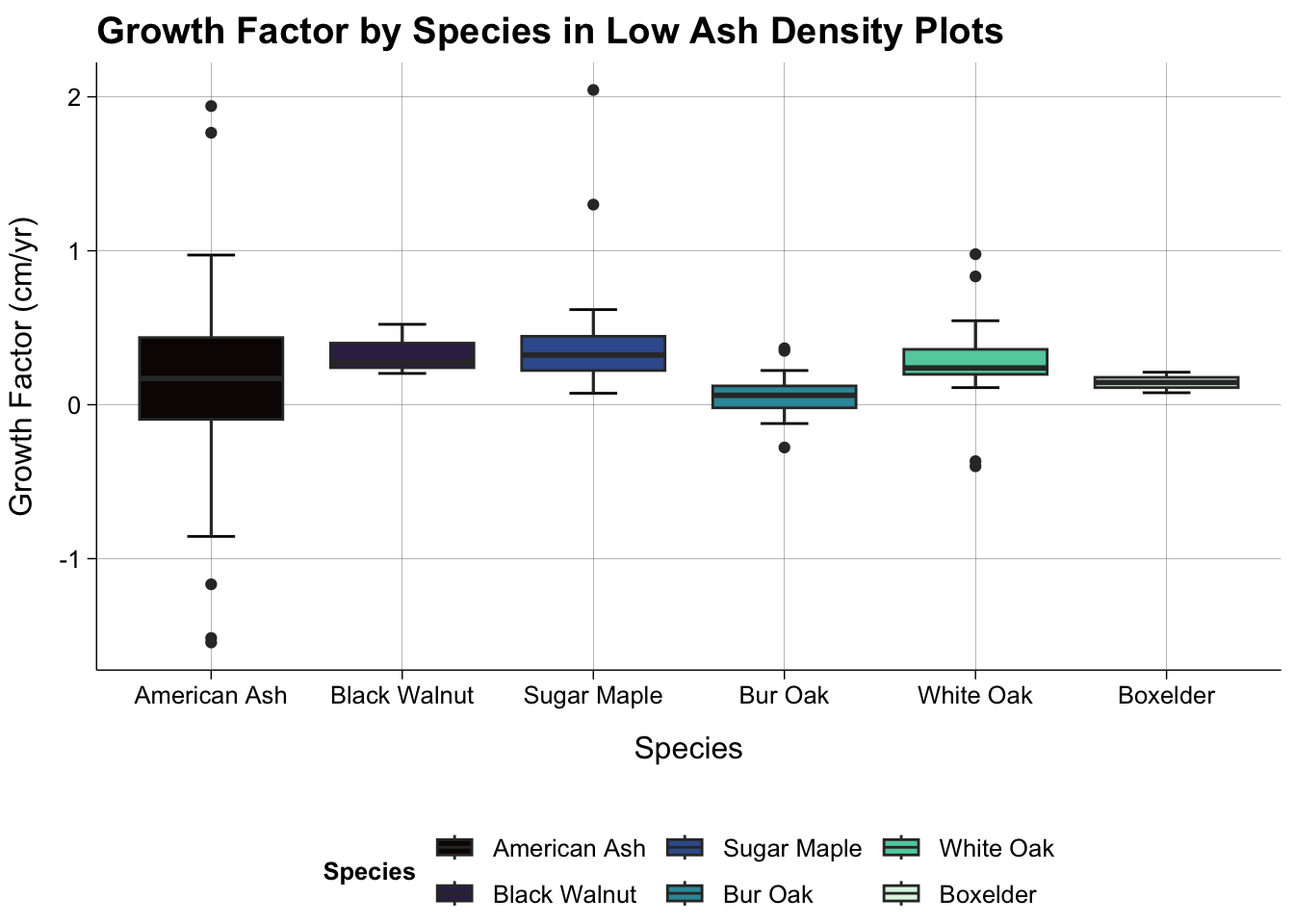 labs(title = "Growth Factor by Species in Low Ash Density Plots",